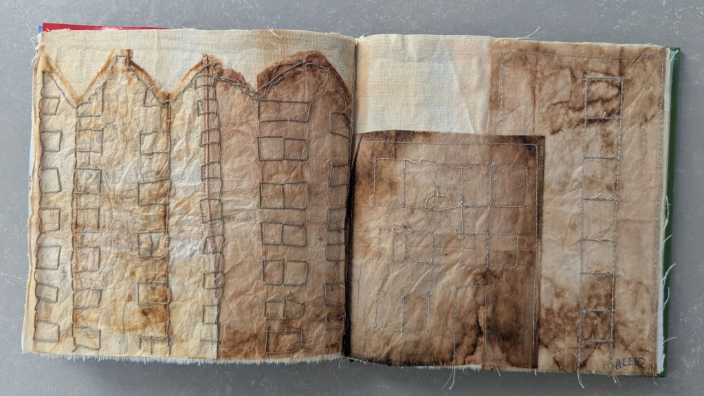 Met onze groep Achterdoek hebben we een boekjesruil gedaan, een soort Round Robin maar dan met boekjes. Elke maand werden de boekjes doorgeschoven naar een volgend persoon die één of twee bladzijden vulde en vorige week kregen we onze eigen boekjes terug. Bij de meesten mocht je helemaal zelf kiezen wat je in het boekje wilde doen, maar sommigen hadden een onderwerp gekozen, ik had architectuur. Vandaag heb ik de voor- en achterkant van mijn boekje gemaakt: