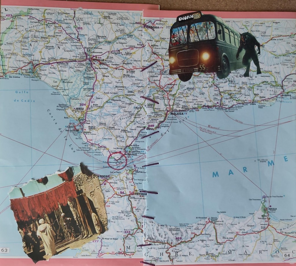 Rosanne heeft wel alle vijf woorden gebruikt en er een mooi verhaal bij verzonnen. Deze griezel is met zijn Engelse bus met glas-in-lood ramen op weg naar Tarifa, in het zuiden van Spanje, om textiel te kopen dat vanuit Marokko met de boot daar naar de markt is gebracht. Onderweg is hij al een paar keer verkeerd gereden en uit frustratie verscheurde hij de kaart. Die heeft hij zo netjes mogelijk met pruimpaarse steken weer in elkaar gezet.