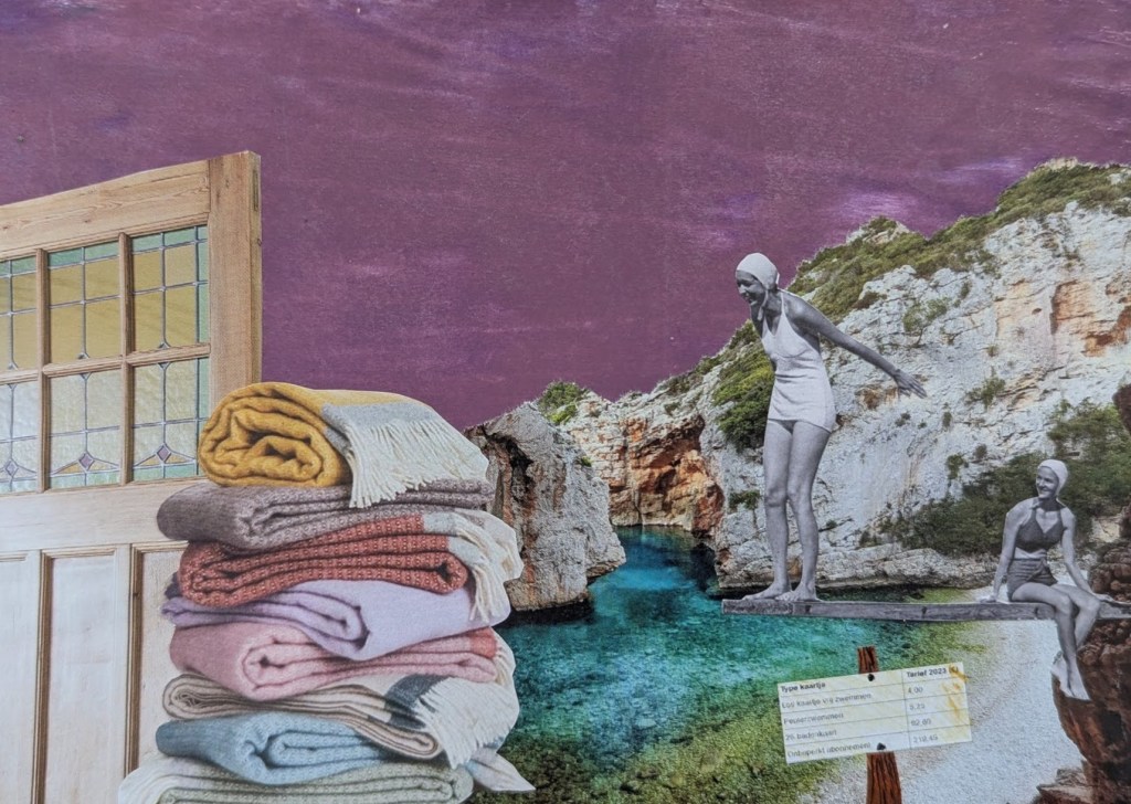 Waar het vorige week zoveel moeite kostte zat deze collage heel snel in elkaar. De woorden waren: pruimpaars, textiel, glas-in-lood, Engelse bus, tarieven. Ik besloot al snel de Engelse bus te laten vallen en daardoor kon ik er beter een verhaaltje van maken. Onder de pruimpaarse lucht vermaken twee dames zich bij het water, de tarieven zijn op het bord vermeld, maar ik vraag me af of ze een kaartje hebben gekocht. Na het zwemmen gaan ze snel naar huis waar bij de deur met glas-in-lood raampjes de warme dekens al klaar liggen (textiel).