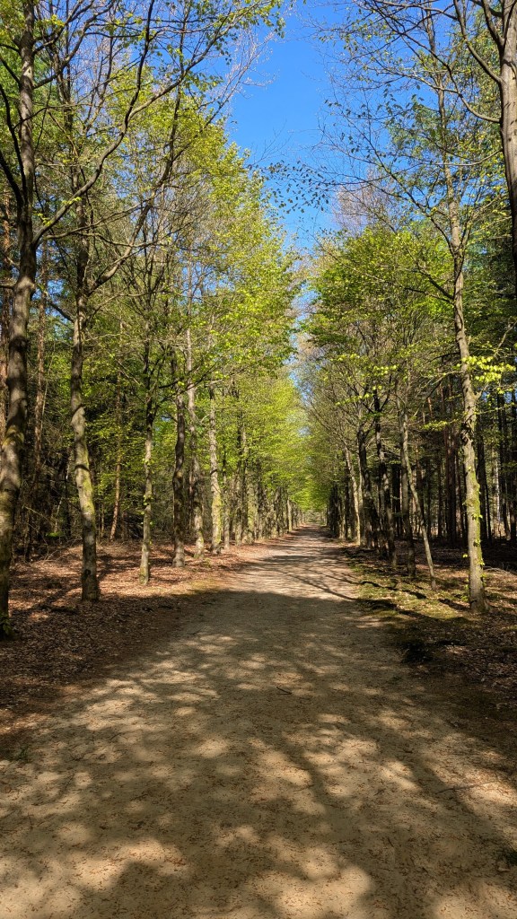 Woensdag zou het warm worden en dan is het heerlijk om in het bos te lopen. We kozen een trage tocht vanuit Dieren door de heuvelachtige beukenbossen van Hof te Dieren en Hagenau, vervolgens door de dennen- en berkenbossen langs de Fagelsheide en de IJzerbaan en tenslotte door de Onzalige Bossen. Het zonlicht schijnt zo mooi door de bomen.