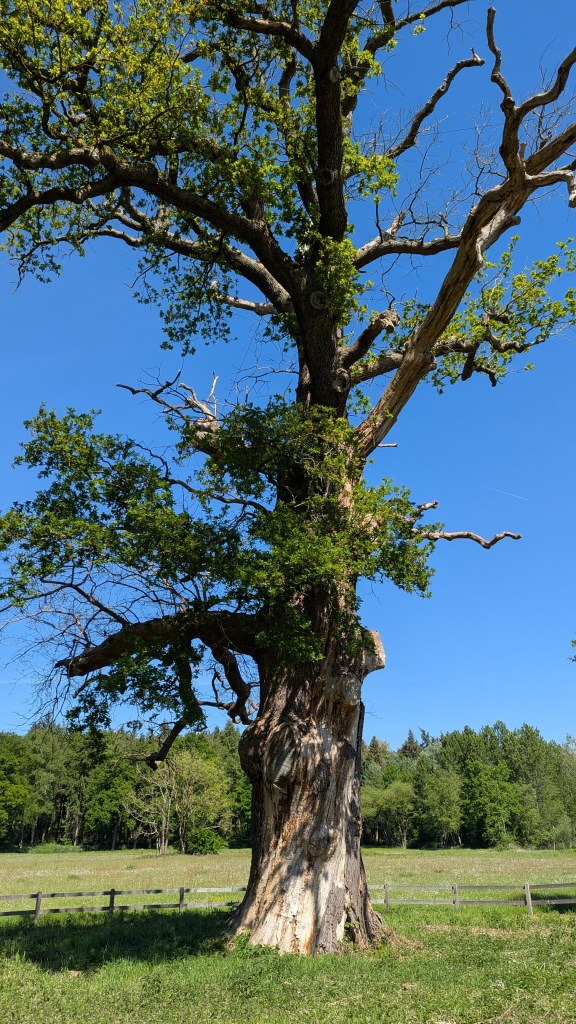 Bij de Dikke Boom, waarschijnlijk de dikste eik van Nederland met een stamomvang van ongeveer 7,8 meter hebben we zitten eten. De boom is tussen de 400 en 500 jaar oud en niet echt mooi meer, al was hij aan de ene kant wel groen uitgelopen.
