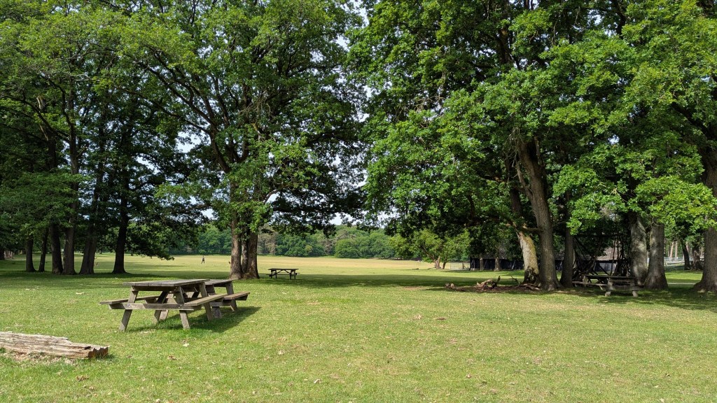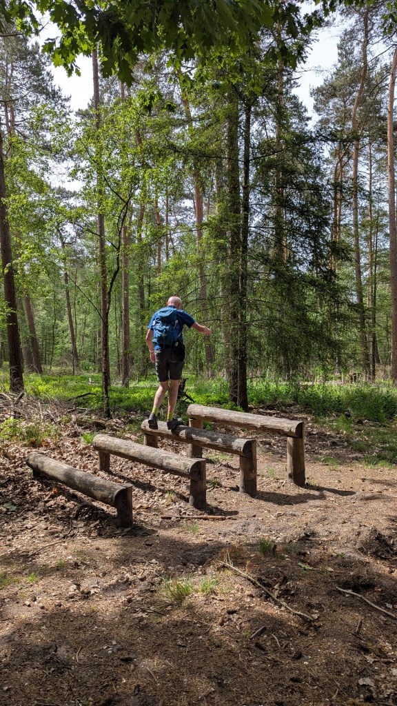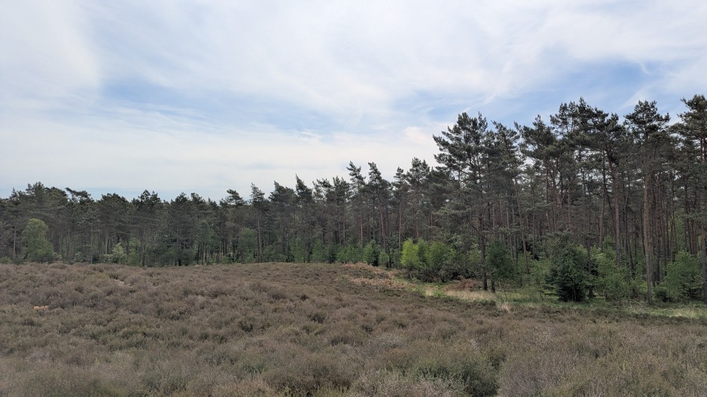 Afgelopen winter liepen we deze tocht ook een keer, maar nu met al het groen ziet het er toch weer heel anders uit. Omdat het behoorlijk warm zou worden kozen we een tocht die door het bos ging, al liepen we ook flinke stukken langs en over de hei. Deze keer parkeerden we bij de Schaapskooi en dronken daar eerst onze koffie/thee, genoeg bankjes.