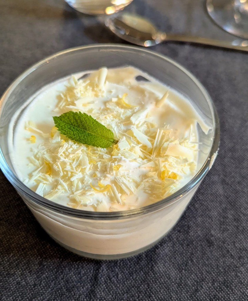 ‘s Avonds konden we aanschuiven bij table d’hôte, waar we gezellig zaten met zijn achten. Manou had heerlijk gekookt, eerst uiensoep, toen zalm uit de oven met tapenade, gebakken aardappeltjes en spinaziesalade en als toetje citroenmousse. Manou had het toetje speciaal voor Aat suikervrij gemaakt en voor het ontbijt zelfs suikervrije jam gemaakt.