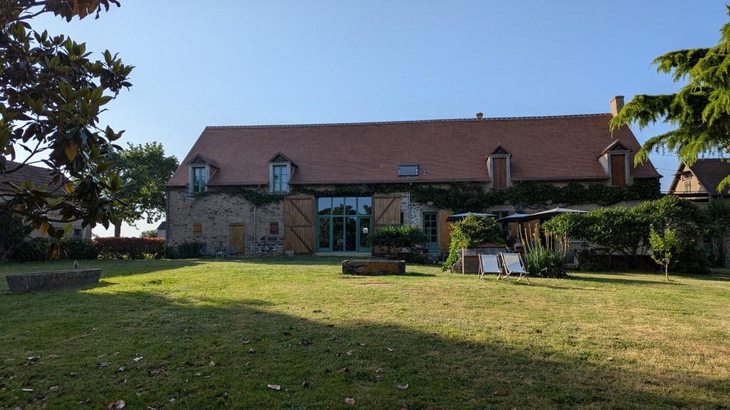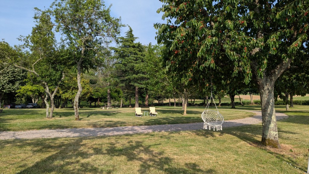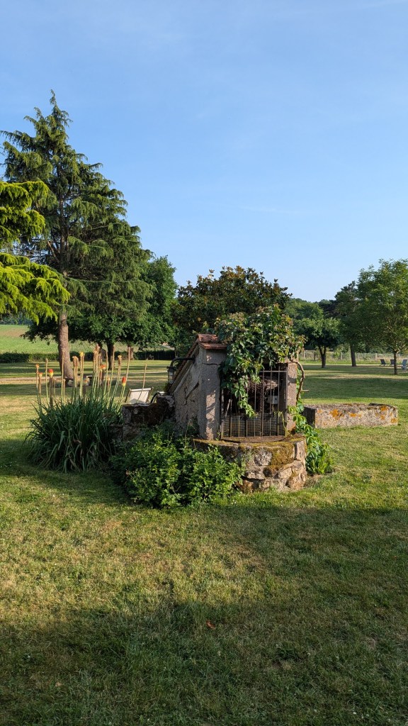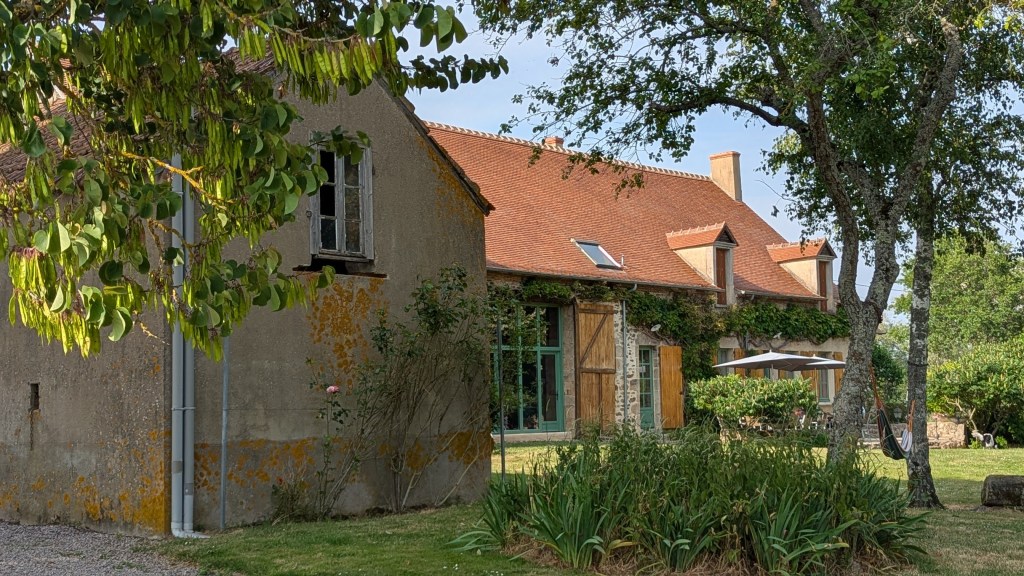 Dinsdag liepen we naar ons volgende adres in Urciers, chambres d’hôtes La Maison du Cerf, een prachtig huis met 5 gastenkamers en een enorme tuin. Dit was een lange tocht, nl. 23 km en het zou een warme dag worden. We konden ervoor kiezen eerst een stukje te worden weggebracht maar we konden ook vanuit La Cellette beginnen en als het ons teveel werd bellen en dan zouden we worden opgehaald. We hebben echter het hele traject gelopen en waren al voor 4 uur op onze bestemming. Voor onderweg hadden we heerlijke kersen uit eigen tuin meegekregen.