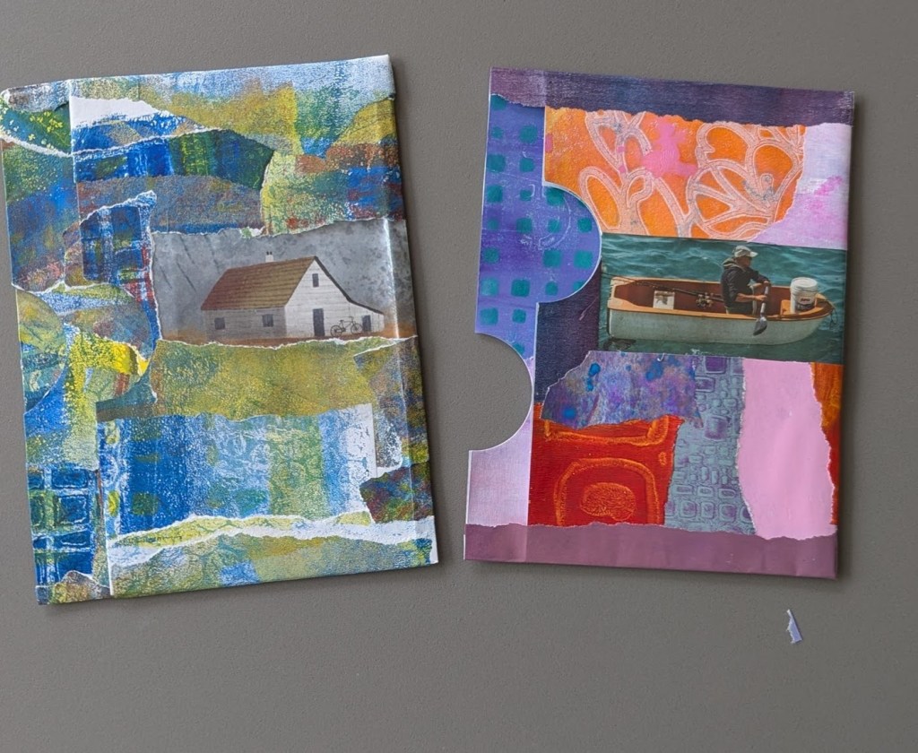 Gisteren kwam Mieke weer een dagje hobbyen, zij had iets bedacht n.a.v. een filmpje van Joke Hardenbol. We hadden een vensterenvelop nodig, een leuk plaatje, geverfd of ander mooi papier en natuurlijk lijm. Eerst lekker bijkletsen over de vakantie, we waren allebei naar Frankrijk geweest, en daarna aan de slag. Mieke had al eerder zo’n boekje gemaakt, de linker is van haar, de rechter van mij.