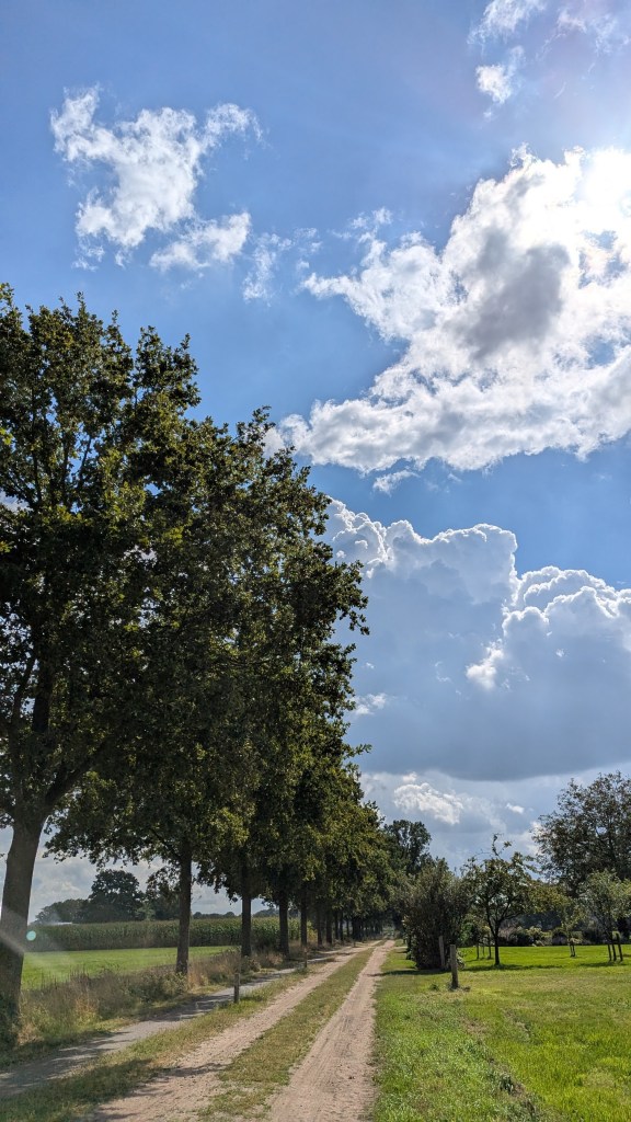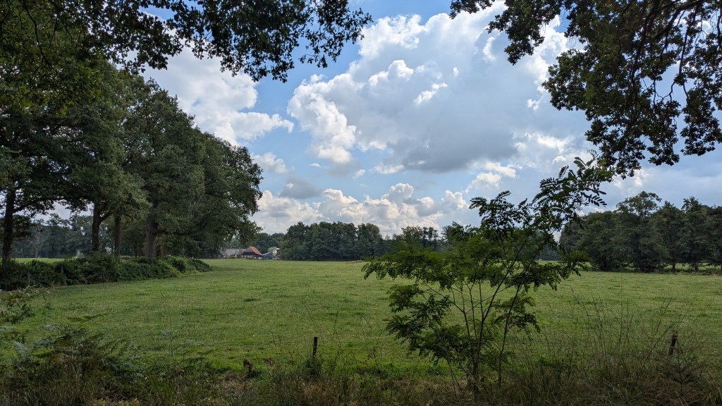 Toen we wilden pauzeren om onze boterhammen te eten was “ons” bankje al bezet en omdat er volgens de app “alle bankjes” geen bankje in de buurt was zijn we maar op de grond gaan zitten. We zaten net toen het ging regenen, gelukkig was het maar heel kort en nadat we even onder een boom geschuild hadden konden we weer verder eten. Verder heeft het ook niet meer geregend. Wel veel bewolking, maar dat levert mooie luchten op.