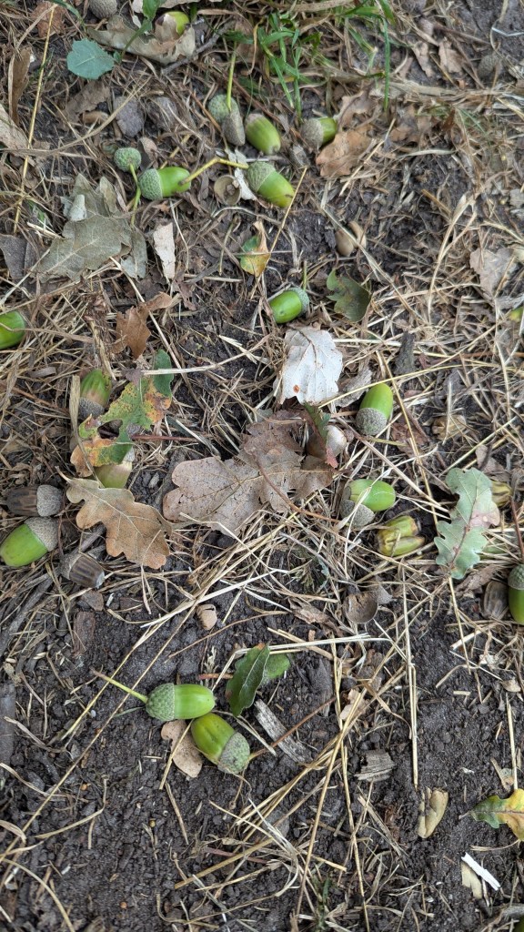 Er lagen heel veel eikeltjes op de grond. Op de parkeerplaats waren we al gewaarschuwd door een mevrouw om de auto wat verder te zetten omdat we net onder een eikenboom stonden en de eikeltjes deuken kunnen veroorzaken.