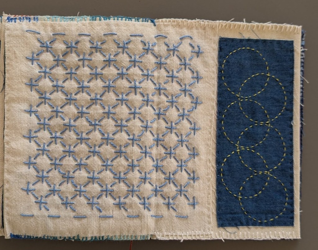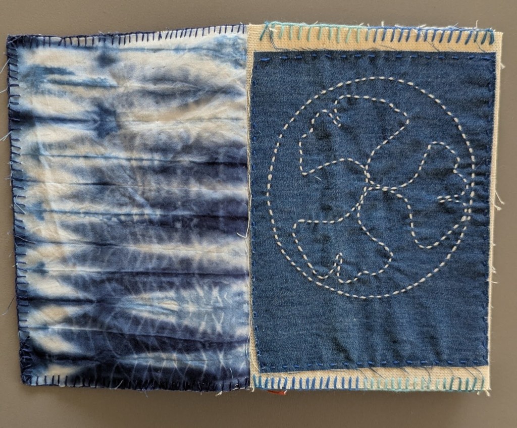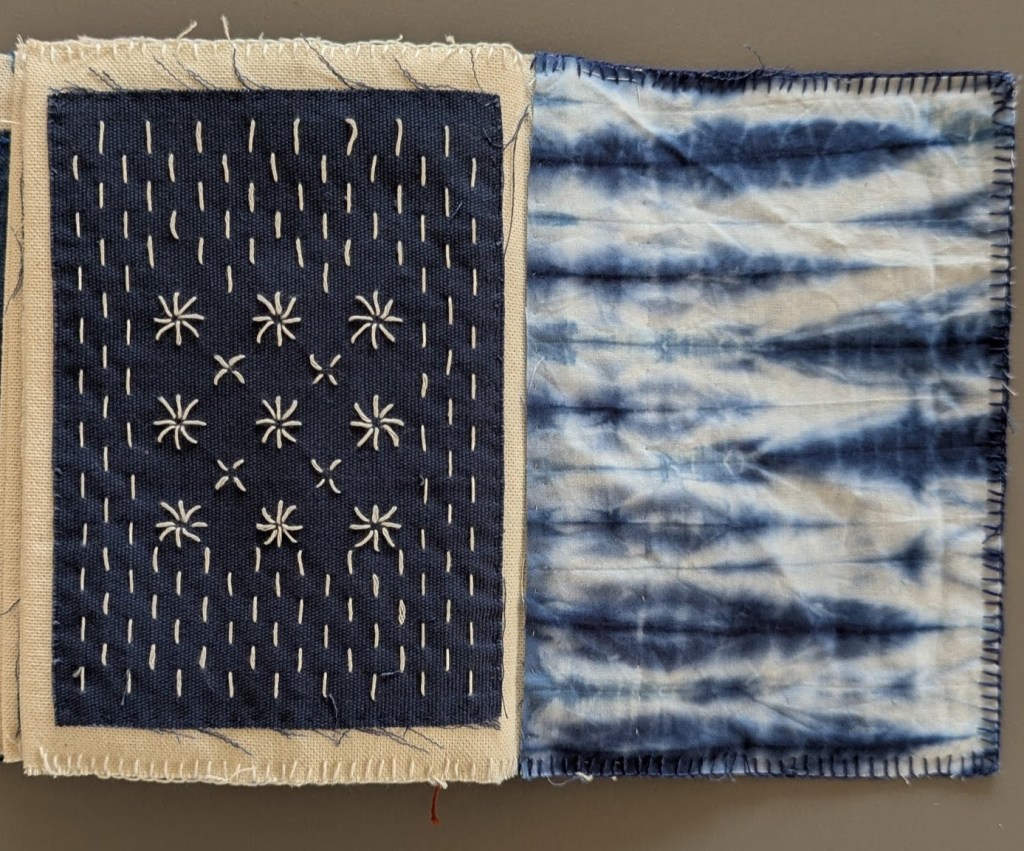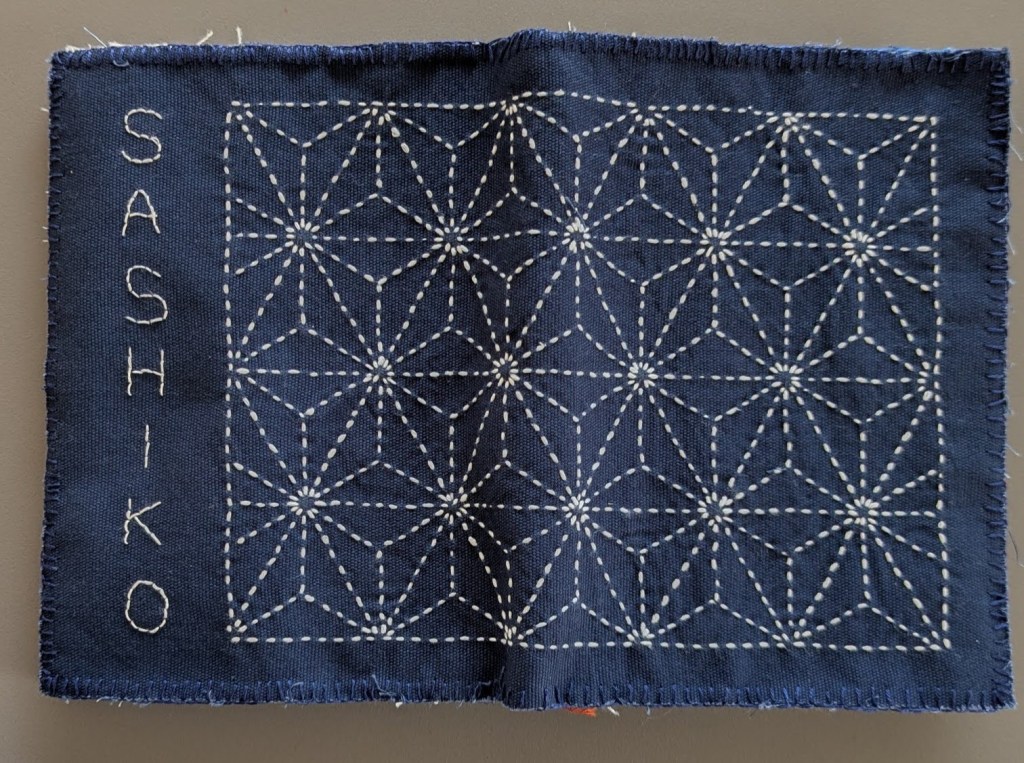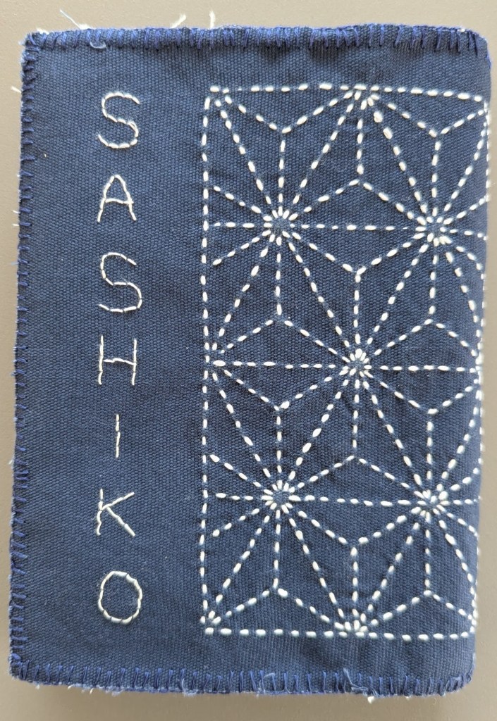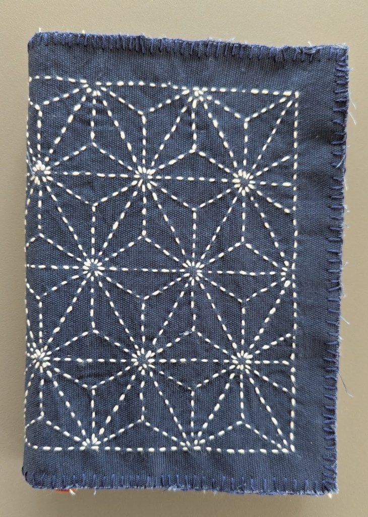 Het boekje met mijn sashiko werkjes is af, voor de omslag heb ik een wat lastiger patroon gekozen: Asanoha. Het patroon heb ik met wit carbonpapier overgetrokken op de stof. De voor- en achterkant:
