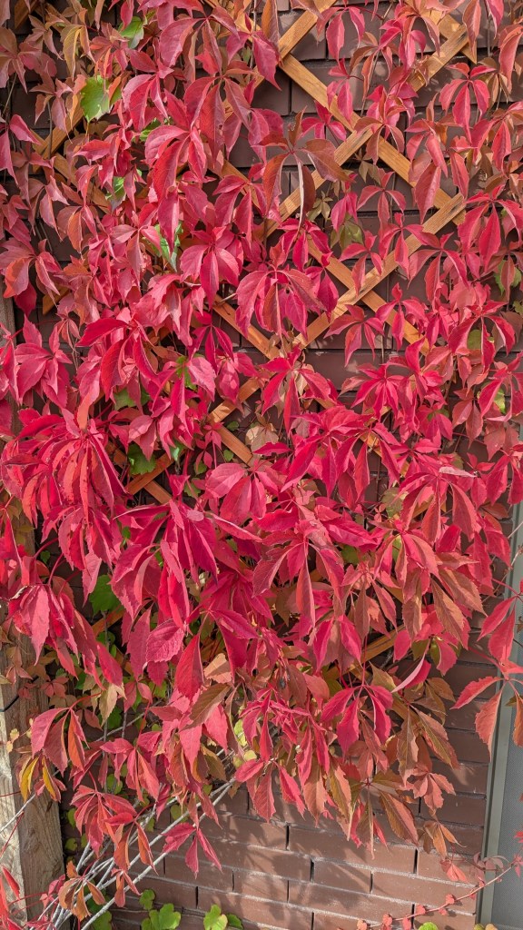 Een blog zonder foto is een beetje saai, vandaar een foto van onze mooie wilde wingerd.