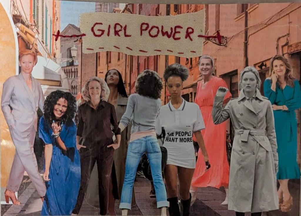 Deze week is het thema van de door Conny georganiseerde bloghop Vrouwen. Ik heb een collage gemaakt met bekende en onbekende vrouwen die op straat lopen. Boven hun hoofden een spandoek met Girl Power. Ze voelen zich vrij en blij op straat, zoals het hoort. De woorden heb ik geborduurd.