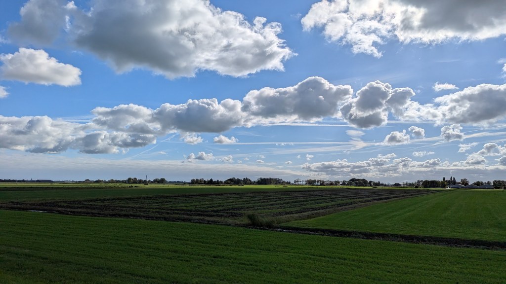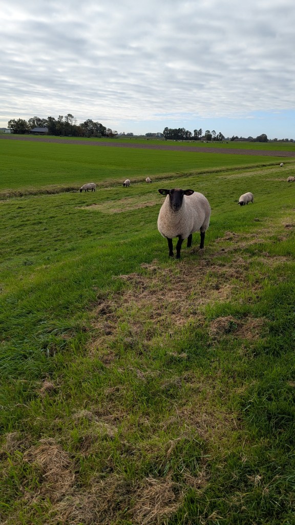 Nu liepen we over eindeloze rechte grasdijken met hier en daar wat schapen. De lucht was wat blauwer dan de dag ervoor, al was het in het begin nog wel fris.