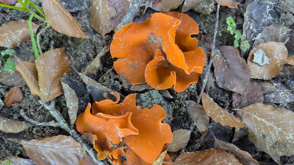 Vandaag liepen we de trage tocht Slangenburg bij Doetinchem, deze tocht hadden we in april ook gelopen maar was nu met alle herfstkleuren weer heel anders. Het zonnetje scheen vandaag wat toch wel wat mooiere foto’s oplevert dan wanneer het zo grijs is als eerder deze week. We parkeerden bij het kasteel en hebben eerst op een bankje in de zon onze koffie/thee gedronken. Vervolgens liepen we door het bos bij Slangenburg en kwamen deze bijzondere paddenstoelen tegen, de oranje bekerzwammen.