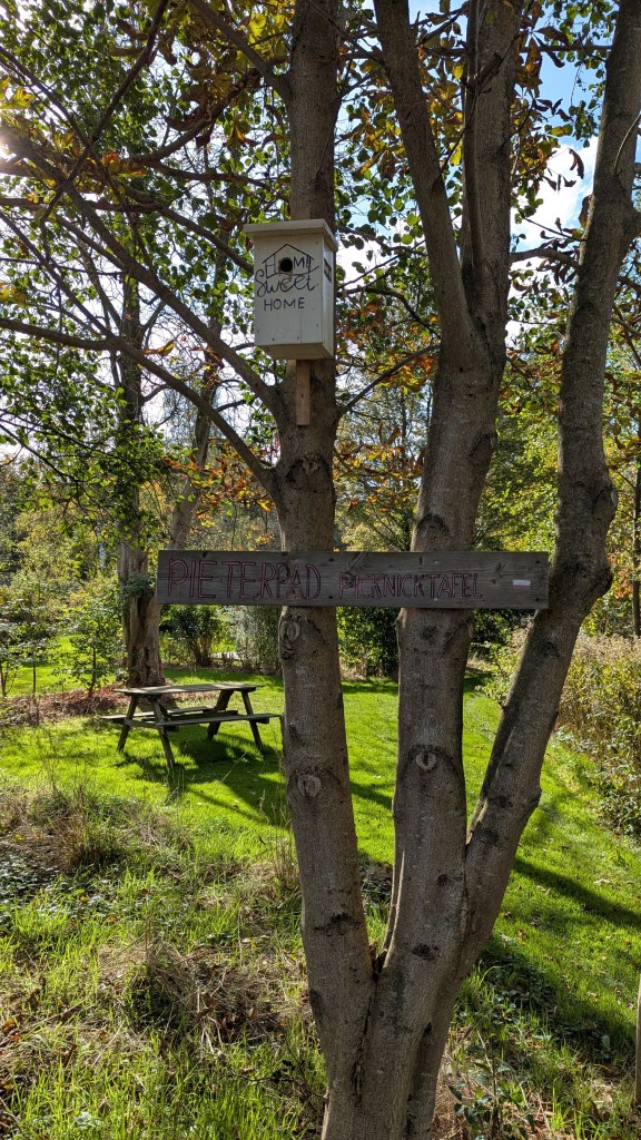 Bij een camping stond een picknicktafel, volgens het bord speciaal voor Pieterpad lopers, maar wij zijn er toch even gaan zitten. In 2017 liepen we hier het Pieterpad, ik weet niet of de bank er toen ook al stond.