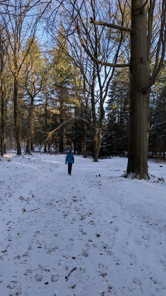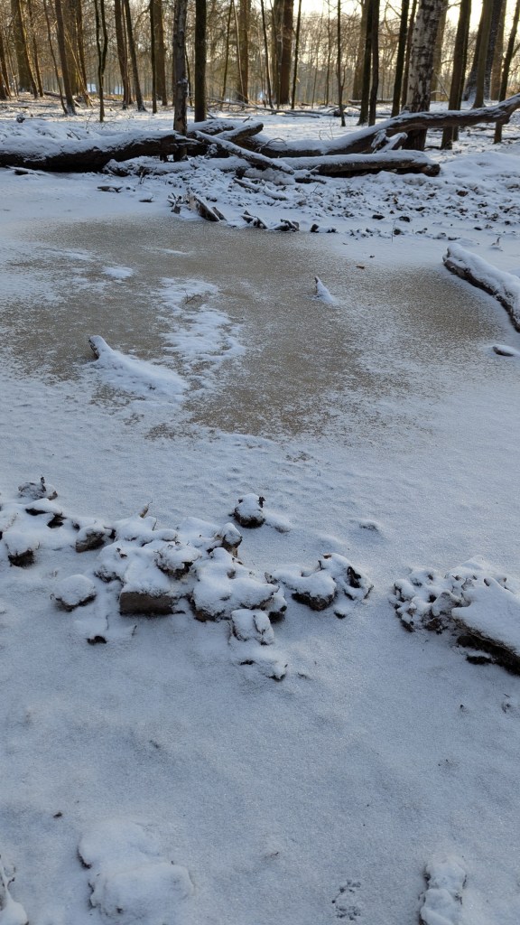 Gisteren dooide het de hele dag en was er aan het eind van de dag niet veel meer van de sneeuw te zien in onze tuin. Toen we vanmorgen wakker werden lag er ineens weer een witte laag, er was heel koud weer voorspeld dus besloten we naar het bos te gaan voor een wandeling, daar loop je beschut.