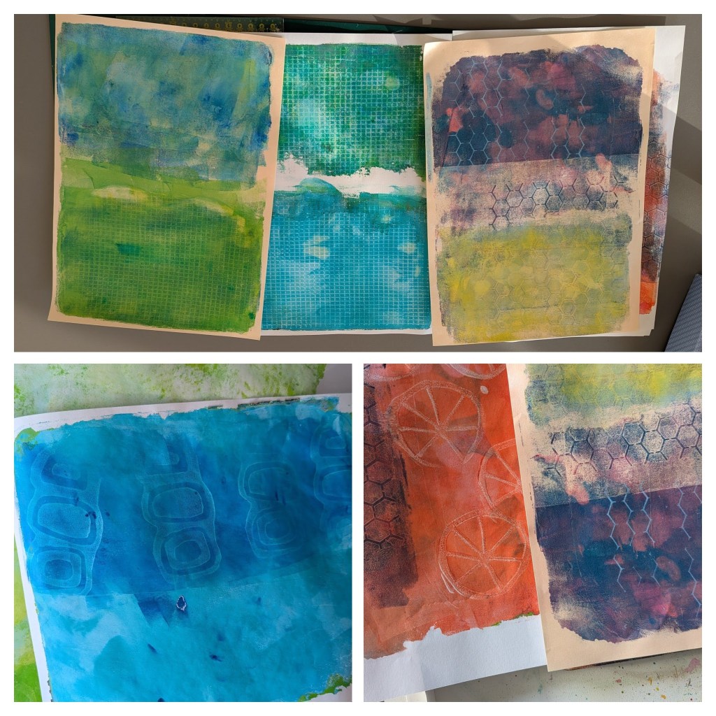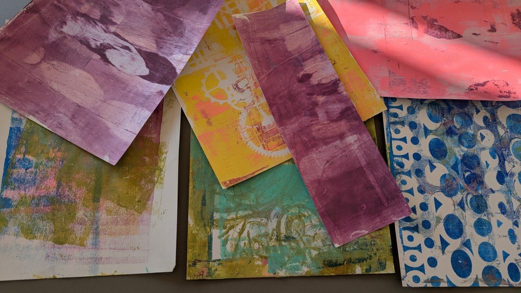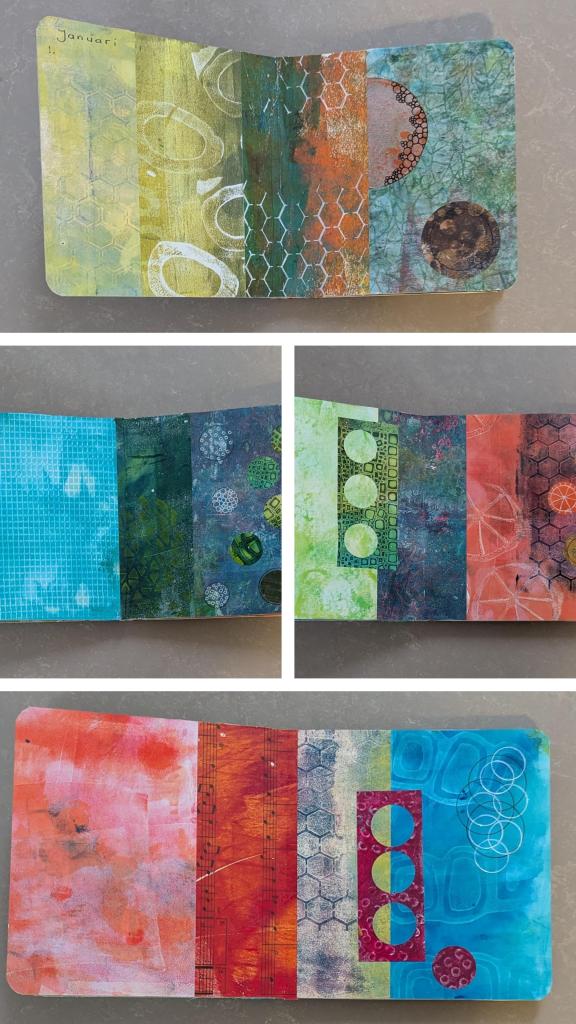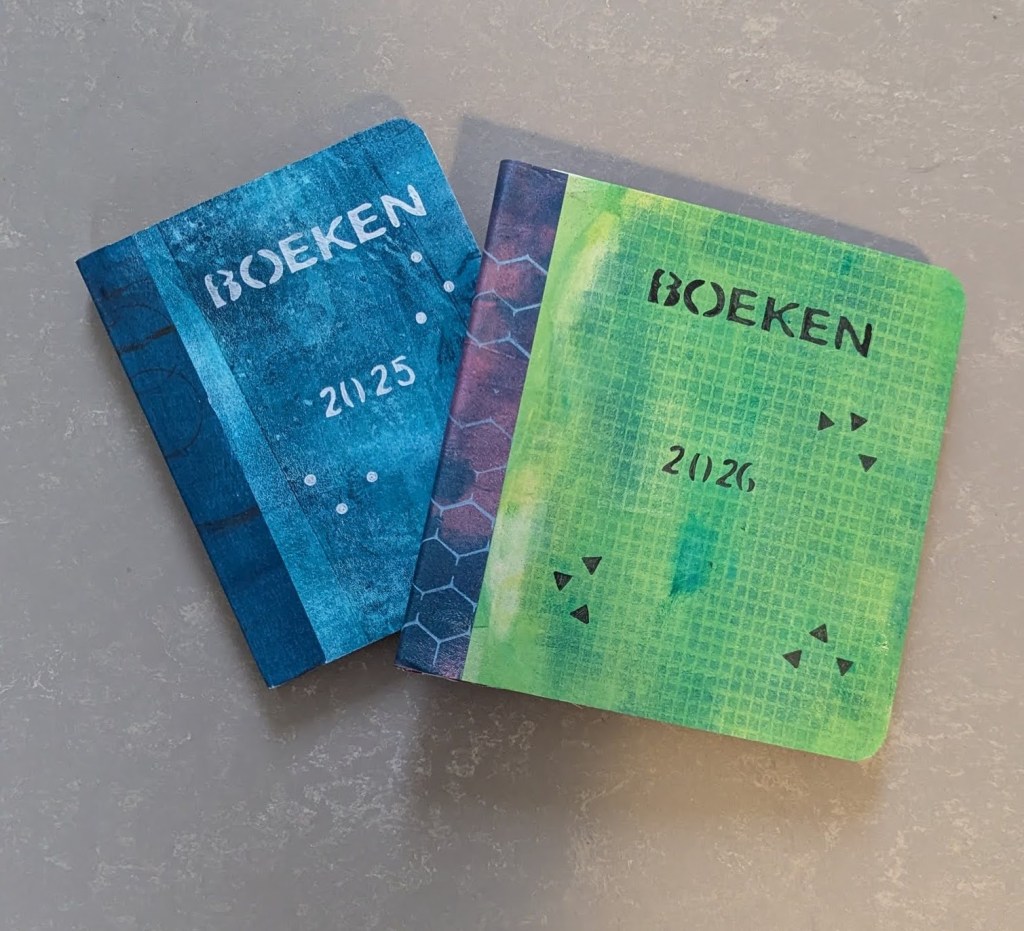 Afgelopen woensdag kwam Mieke weer een dagje hier, we hadden niet echt een onderwerp deze keer maar besloten aan de slag te gaan met de gelli plate. Ik wilde graag een nieuw boekje maken om de gelezen boeken in 2026 bij te houden net zoals ik in 2025 had gedaan en Mieke wilde wat materiaal hebben om kaarten te maken. De tafel stond al snel vol met alle benodigdheden.