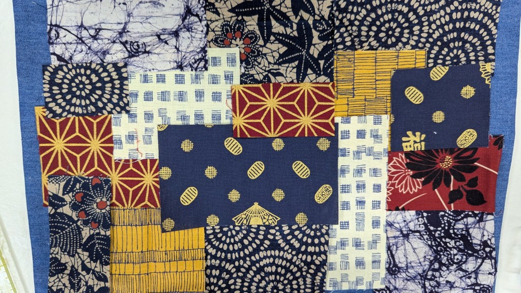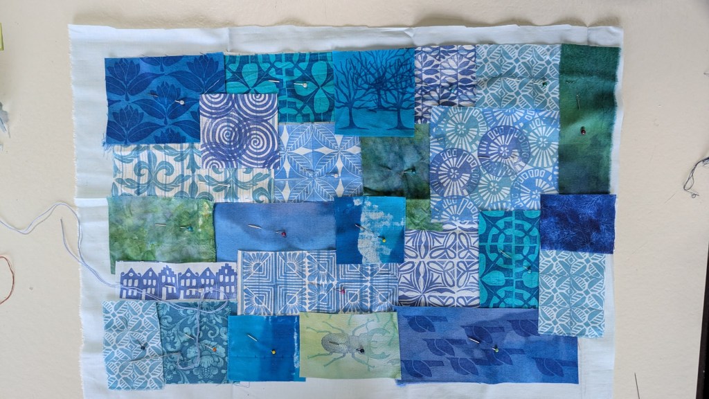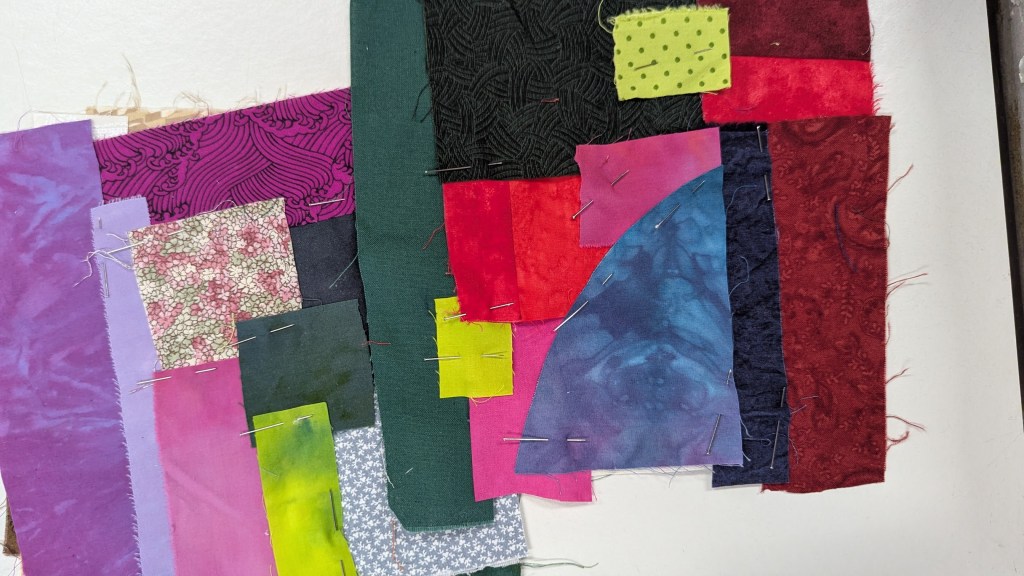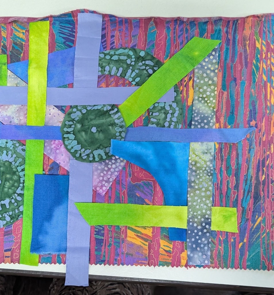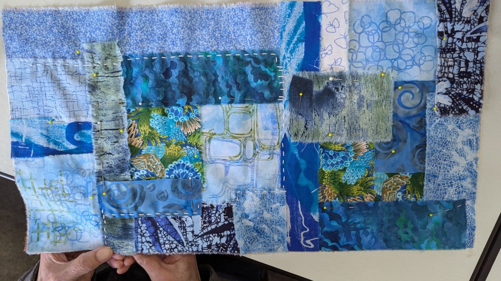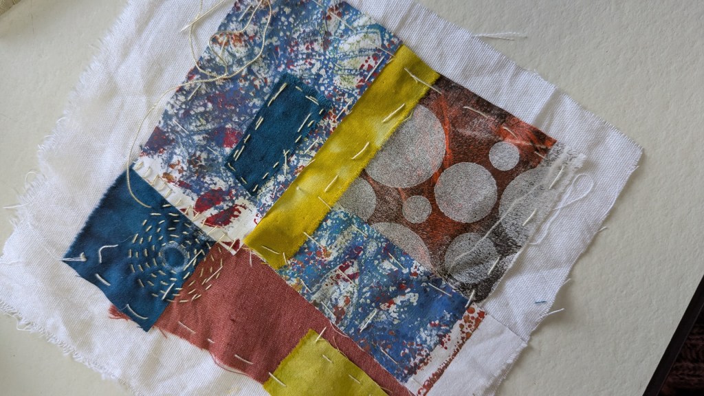 Ik ben aan een placemat begonnen, je legt eerst allerlei lapjes op een ondergrond, speld of lijm of rijg deze vast en zet ze daarna met dik garen en diverse steken, meestal rijgsteken, vast op de ondergrond.