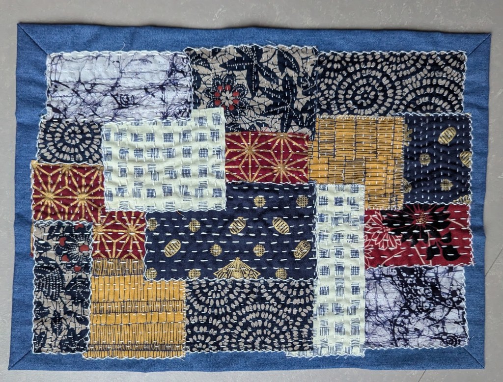 Ik heb de placemat met Boro afgemaakt en wil nu een tafelloper maken met een combinatie van Sashiko en Boro. Hoe weet ik nog niet precies maar dat komt wel al doende. De rafelrandjes van de lapjes heb ik met een soort festonsteek afgewerkt.
