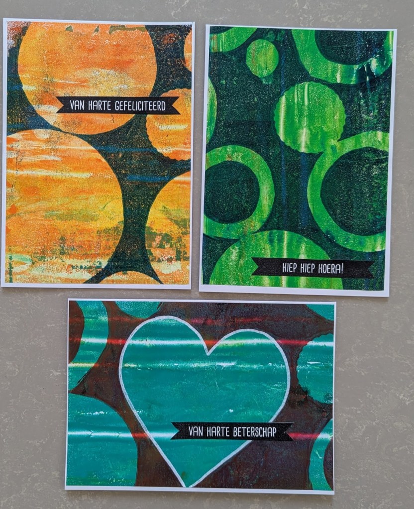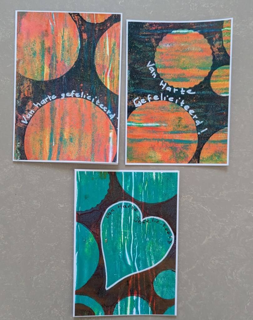 Het rechterpatroon heet Hishi Seigaiha (ruitvorm en golven). Ik vind het heel leuk om te doen, al moet ik wel oppassen voor mijn arm, omdat je met wat dikker garen borduurt kost het soms wat moeite om de draad door te trekken en dat ga ik toch voelen in mijn arm. Ik heb al een tijdje fysiotherapie, gelukkig gaat het vooruit maar ik moet zoiets niet te lang achter elkaar doen. Daarom ben ik ook weer bezig geweest met de gelli plate en heb wat kaarten gemaakt. De streepjes zijn gevormd doordat ik de gelli plate wat gerold heb nadat de verf erop zat. Daarna een andere kleur op de gelli plate en stukken afgedekt met rondjes en harten.