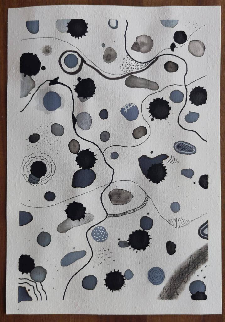 Rosanne schrijft: Op Pinterest zag ik een filmpje waarop iemand grote waterdruppels op een papier liet vallen en daar een kwast met zwarte verf in aanstipte. Nadat alles opgedroogd was, gaf dat heel leuke effecten. Dus ik dacht: laat ik dat ook eens proberen. Bij mij werden de meeste druppels niet heel bijzonder, dus dat was jammer. Uiteindelijk heb ik dit ervan gemaakt en ik vind het toch best leuk geworden.