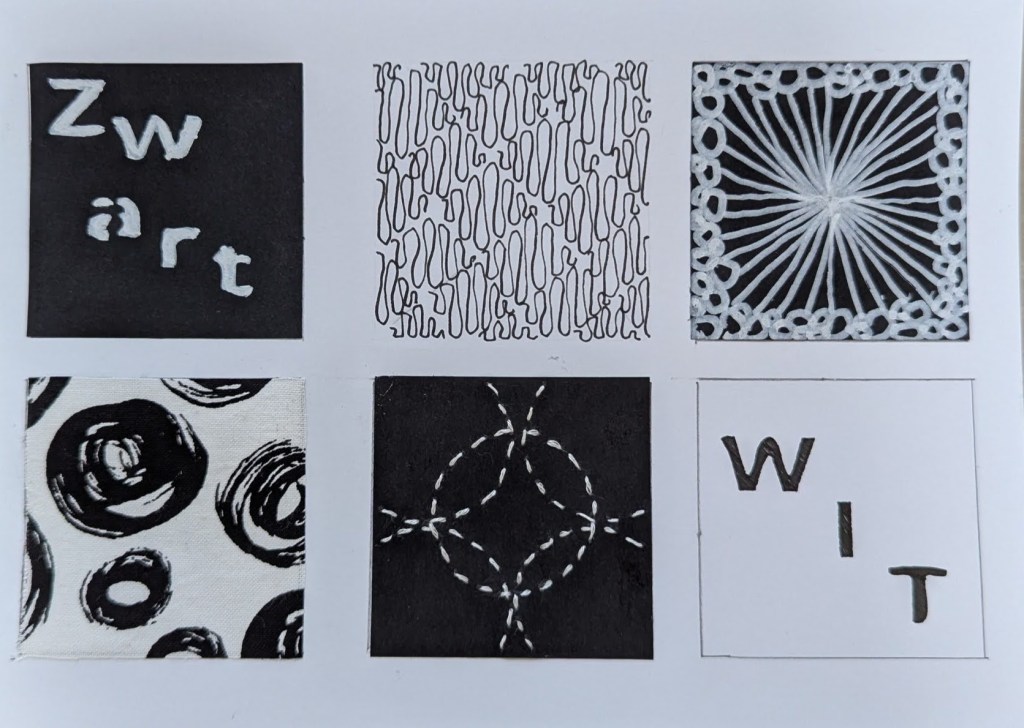 Het onderwerp van de creatieve bloghop is deze keer zwart-wit. Ik heb 6 blokjes getekend op een vel papier en elk blokje op een andere manier ingevuld. De letters met een sjabloon, het tweede en derde blokje met doodles/zentangle, linksonder heb ik een lapje gebruikt en bij het onderste middenblokje heb ik borduursteken toegepast.