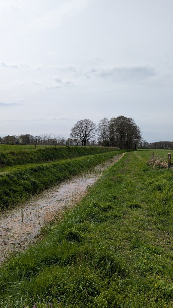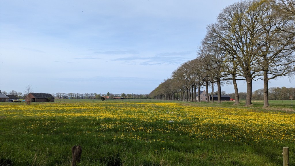 Gisteren liepen we een mooie route van 12,5 km vanaf het toeristisch overstappunt Groot-Nibbelink tussen Varsseveld en Sinderen. Een afwisselende tocht langs open velden, door bos en over oude kerkenpaden. Vijf jaar geleden waren we hier ook eens geweest, nu liepen we de route in tegengestelde richting, de route was aangegeven met pijltjes. Heel veel velden vol paardenbloemen, mooie bospaadjes en langs lange sloten.