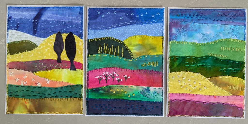 Ik heb weer een voorraadje kaarten van restjes stof gemaakt voor de verkoop in de Martinikerk in Doesburg. Er zijn er nu 9 af en ik ben aan de 10e bezig, ook wil ik nog wat papieren kaarten maken en dan breng ik ze volgende week naar de kerk. Vooral die van stof zijn altijd zo weg, maar deze kosten veel tijd en ik werk er zo nu en dan aan.