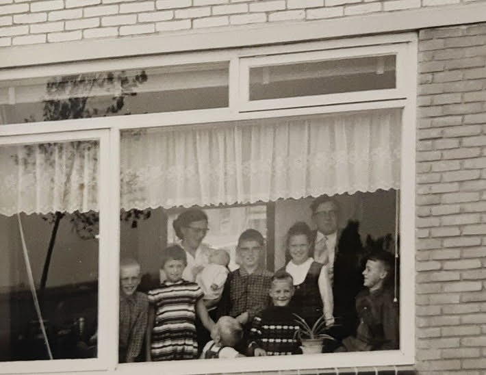 Vandaag is het 50 jaar geleden dat mijn vader overleed, op Goede Vrijdag. Hij was toen 51 jaar, een klap voor ons gezin, mijn jongste zusje was nog maar 9 jaar. Mijn vader was een harde werker, hij was boekhouder, deed veel werk voor de kerk, was penningmeester van allerlei instanties en had ook nog een stencilkantoor aan huis. Hij was trots op zijn 8 kinderen, hier een foto waarop we allemaal staan, ik ben het meisje rechts met het knotje.