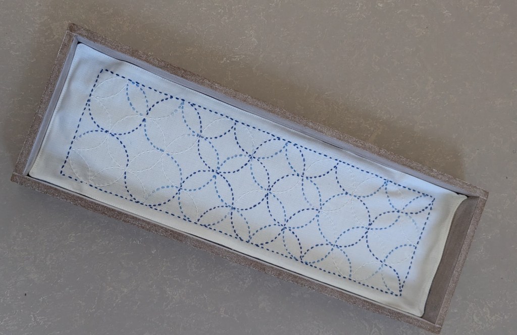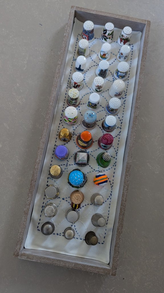 Ik schreef al eerder dat ik iets zocht om mijn verzameling vingerhoedjes uit te stallen, ze staan nog steeds los op de kast en dat is niet echt handig. Een klein letterbakje kon ik nergens vinden, alleen heel grote, maar afgelopen week zag ik een handig bakje bij Staarink en ik maakte er een klein kleedje voor met Sashiko borduurwerk.